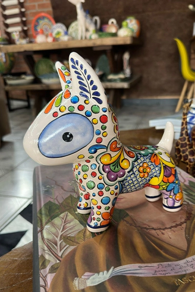 Com sua postura firme, olhar curioso e alma vibrante, este Bull Terrier de cerâmica é uma peça única, feita à mão e inteiramente decorada com os tradicionais desenhos da Talavera mexicana.