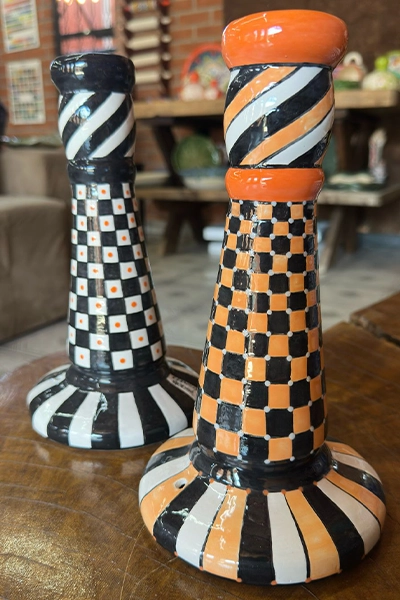 Um objeto de arte que vai além da beleza — este castiçal de para velas em cerâmica é uma verdadeira celebração do artesanal e da funcionalidade. Feito à mão com riqueza de detalhes, combina padrões ousados em preto, branco e laranja, evocando o charme lúdico das colheitas de outono com um toque contemporâneo.