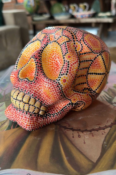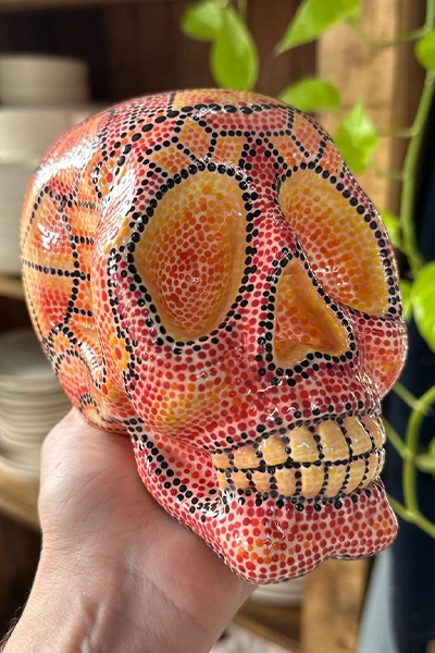 A cabeça de caveira mexicana Uchoua é uma fusão vibrante da tradição do dia dos mortos com um toque contemporâneo.Decorada com padrões florais, arabescos de cores intensas, transmite a celebração da vida e a conexão com a espiritualidade.Seu desing unico mescla simbolismo ancestral com uma estetica moderna e detalhada.