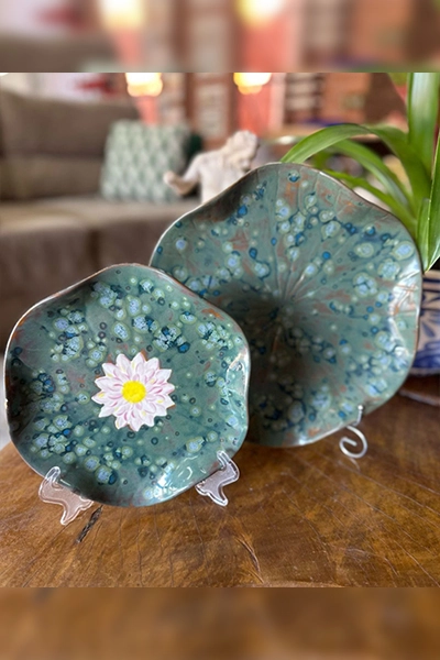 Inspirado na majestosa vitória-régia, esta peça única é uma homenagem à força e delicadeza da natureza amazônica. Com seu esmalte vítreo em tons profundos de verde e azul, e a flor central delicadamente pintada à mão, o prato evoca a imagem serena das águas calmas onde essa planta reina absoluta.