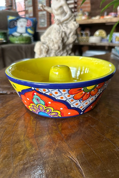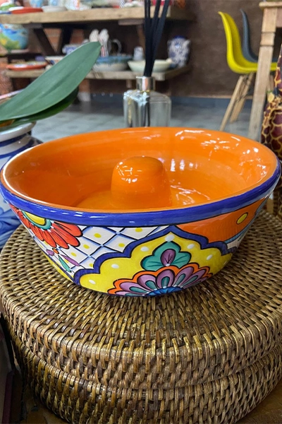 Seu interior amarelo vibrante contrasta com o exterior meticulosamente adornado em desenhos florais e arabescos multicoloridos — tons de laranja, vermelho, azul cobalto, verde e lilás se unem em perfeita harmonia. Essa composição cromática é inspirada nos mercados, nas festas populares e na alma alegre das culturas latinas. Uma explosão de cores que transforma qualquer ambiente.