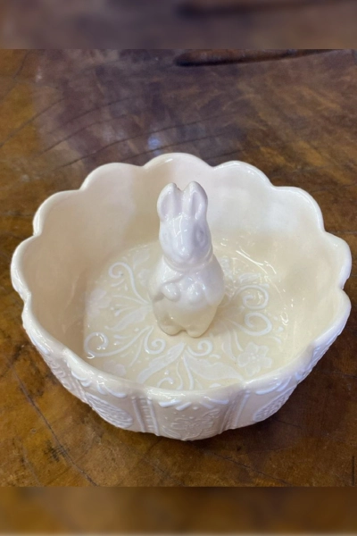 Com formas suaves e delicadas, este organizador de mesa em cerâmica traz no centro um coelho esculpido à mão, como um guardião silencioso da ternura.