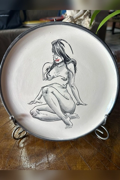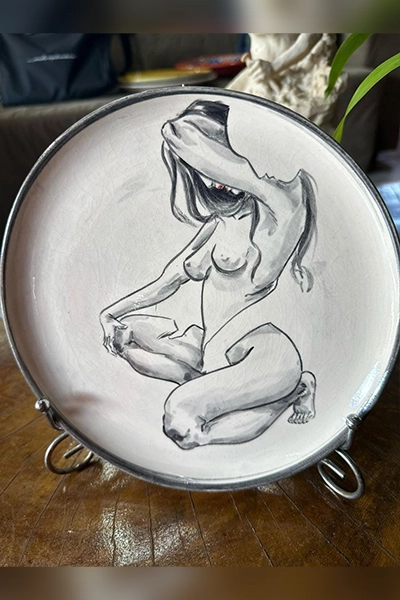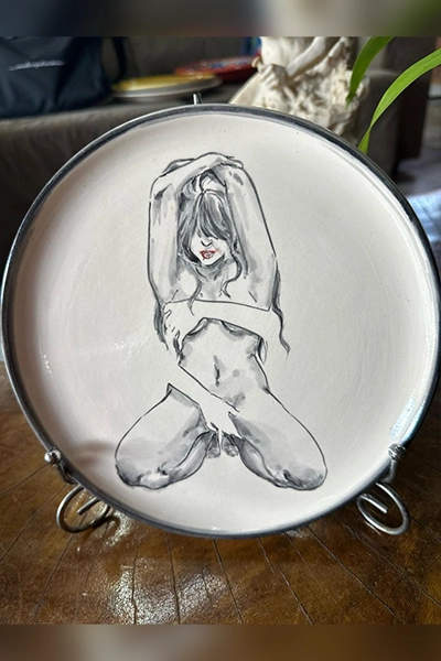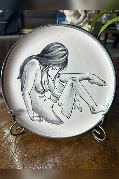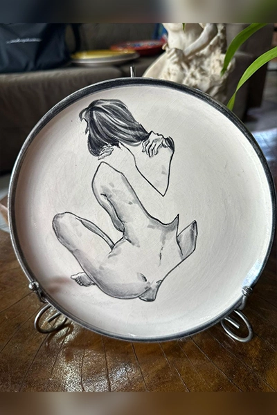 Uma peça que transcende o utilitário e se transforma em arte. Este prato pintado à mão representa com sensibilidade e força as formas do feminino – um corpo em movimento, em introspecção, em transformação. A figura, com traços firmes e delicados em tons de preto e cinza, revela a beleza crua da mulher em sua essência: vulnerável, poderosa, humana.