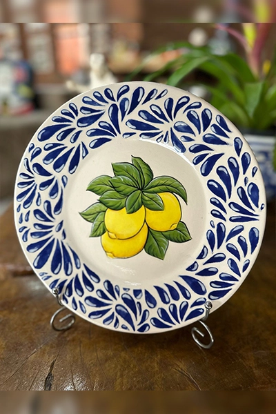 Este prato traz à tona o frescor vibrante e a elegância atemporal da cultura italiana. O limão siciliano, símbolo da costa mediterrânea e da culinária italiana, é retratado com delicadeza no centro da peça, cercado por arabescos em azul profundo que remetem à cerâmica tradicional da Sicília.