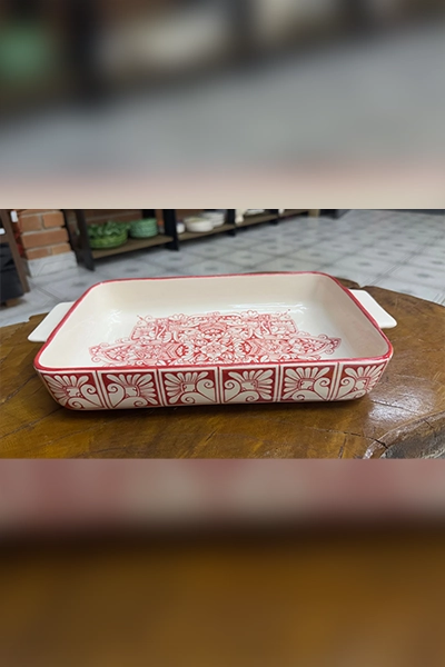 Imagine poder preparar e servir suas receitas favoritas em uma verdadeira obra de arte. Esse refratário cerâmico com desenho geométrico em vermelho não é apenas um utensílio de cozinha — é uma peça de decoração, expressão cultural e afeto em forma de cerâmica.