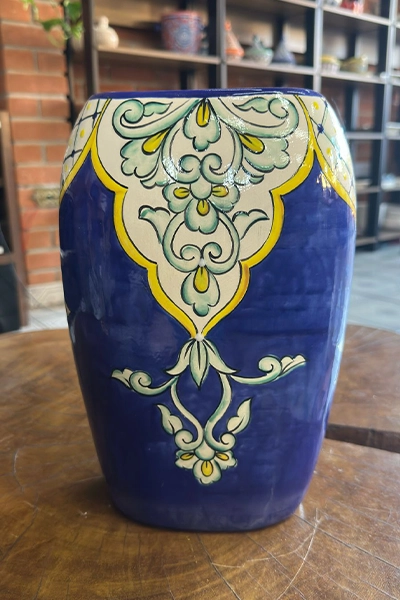 Inspirado na riqueza ornamental das cerâmicas italianas da região de Deruta, este vaso traz em sua superfície um desenho clássico em arabescos florais, com traços delicados em tons de verde, amarelo e branco sobre um fundo azul cobalto profundo – uma cor que remete diretamente à nobreza e serenidade do mar Mediterrâneo.