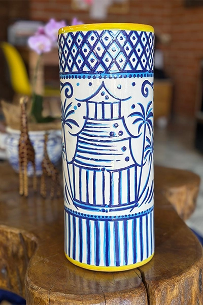 Este não é apenas um objeto utilitário. É uma obra de arte com alma oriental, um convite à beleza, à tradição e à sofisticação. Este porta-guarda-chuva em cerâmica, que também pode ser usado como vaso ou bengaleiro, traz em sua superfície a delicadeza e o simbolismo da pintura clássica chinesa, com traços firmes em azul sobre um fundo branco, e detalhes vibrantes em amarelo que trazem vida e destaque à peça.