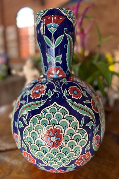 Este exuberante vaso em cerâmica é uma verdadeira joia da tradição artesanal, inspirado na clássica pintura Iznik, originária da Turquia otomana. Cada detalhe floral e geométrico é meticulosamente pintado à mão, revelando a delicadeza e a profundidade dos tons de azul-cobalto, verde e vermelho que caracterizam este estilo ancestral.